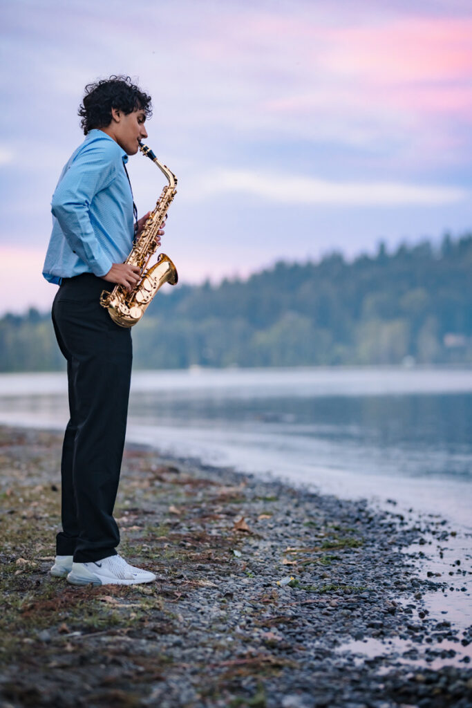 This senior photo session took place during the summer season at Idylwood Park in Redmond, WA. I knew that Ethan played saxophone and so I suggested he bring his instrument along in case we could get creative during our session and capture this part of his journey.